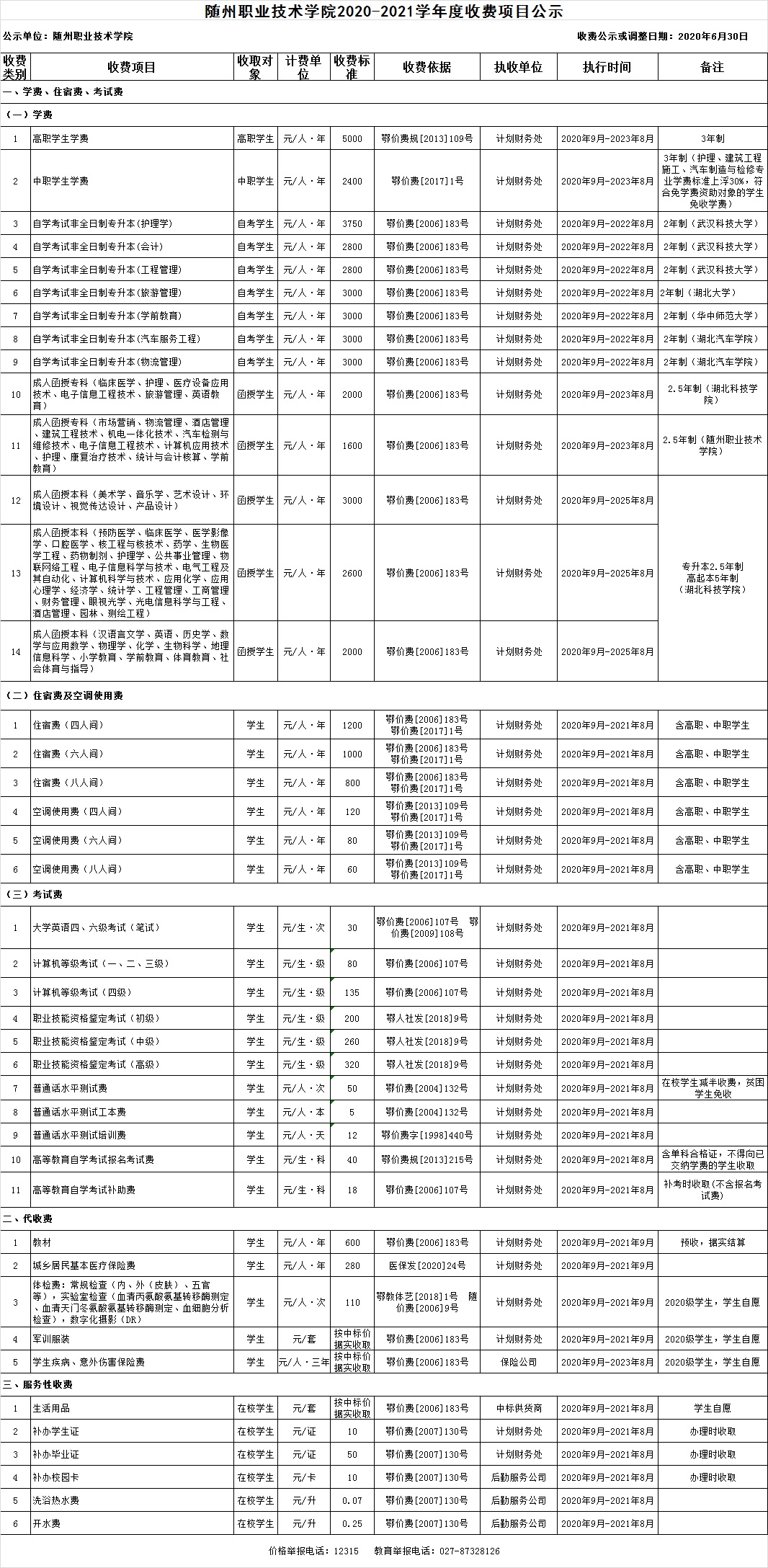 随州职业技术学院2020-2021学年度收费项目公示