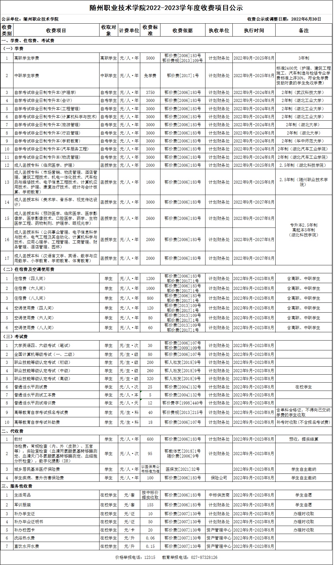 随州职业技术学院2022-2023学年度收费项目公示