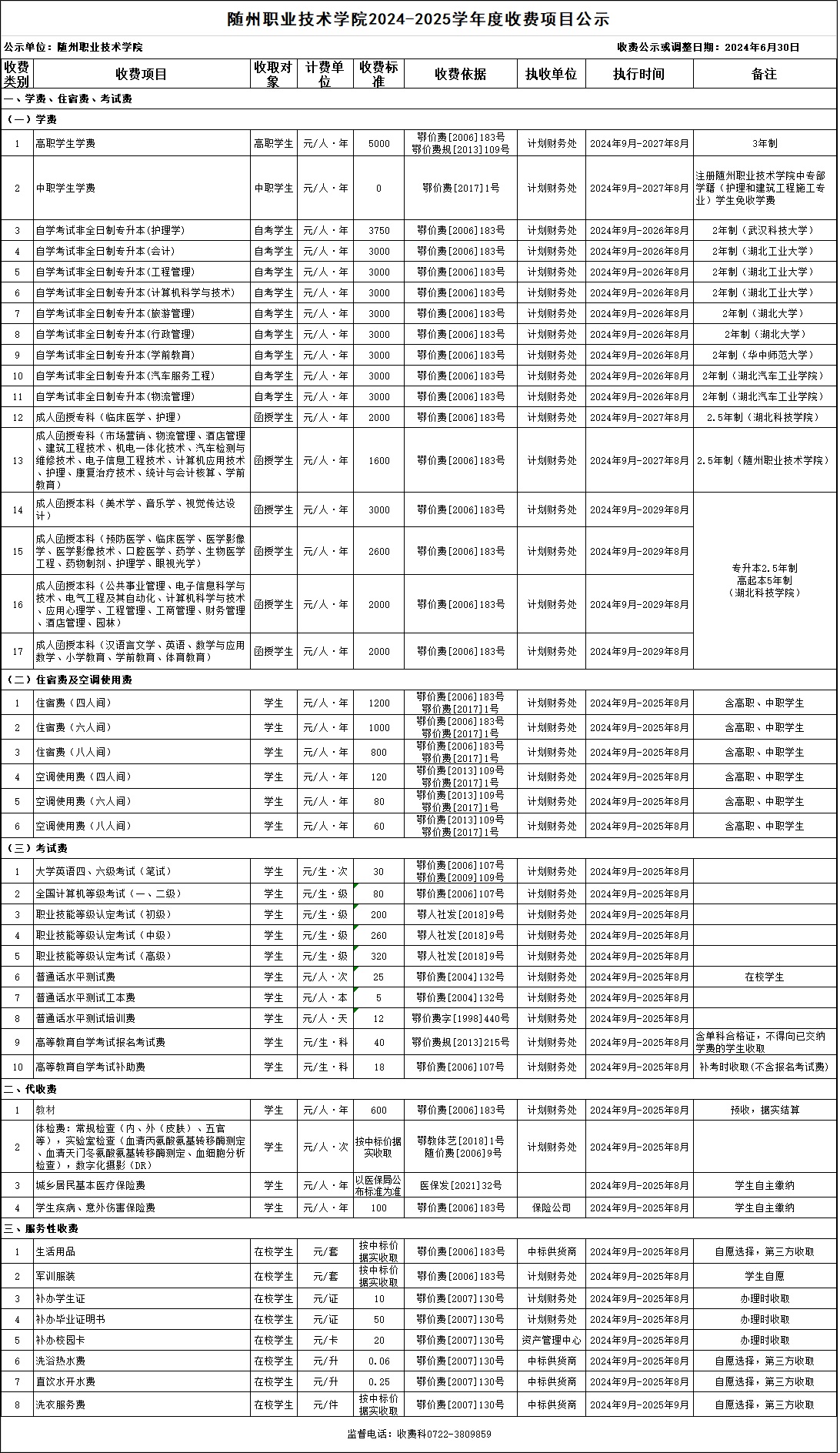 随州职业技术学院2024-2025学年度收费项目公示